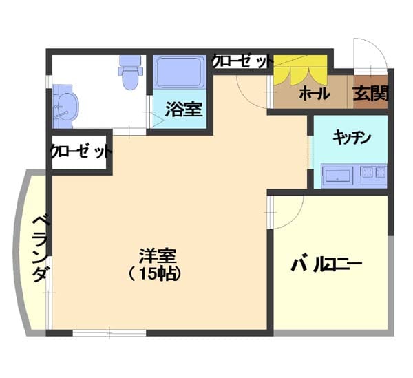 | 詳細間取 | 洋15・キッチン・バルコニー2ヶ所 | ||