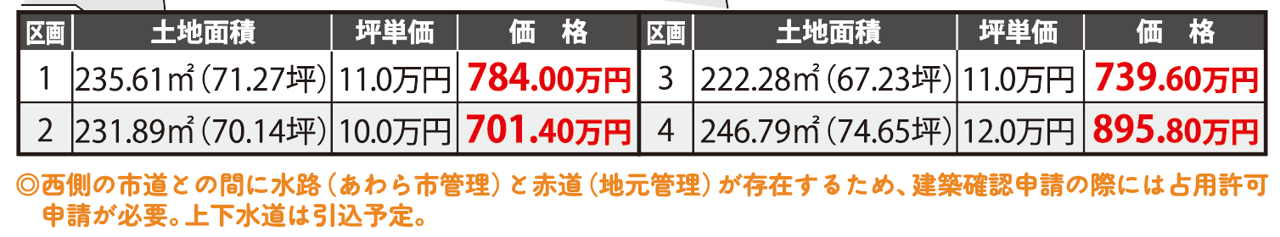 備考 | 西側の市道との間に水路(あわら市管理)と赤道(地元管理)が存在するため、建築確認申請の際には占用許可申請が必要。上下水道は引き込み予定。 | ||