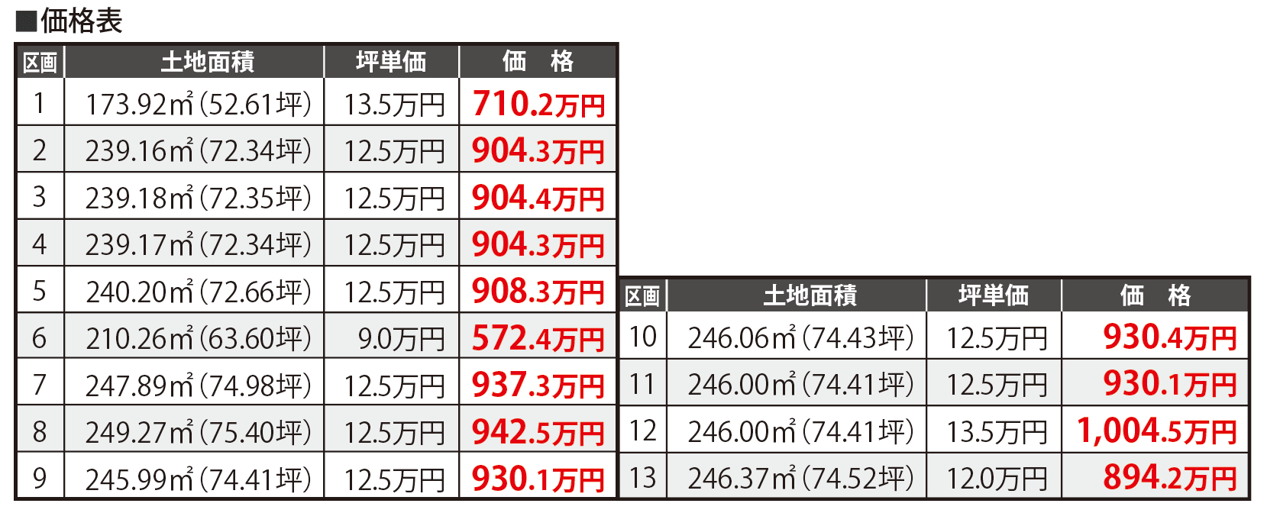 土地面積 | (公簿)173.92m2/52.61坪 ~249.27m2/75.4坪 |