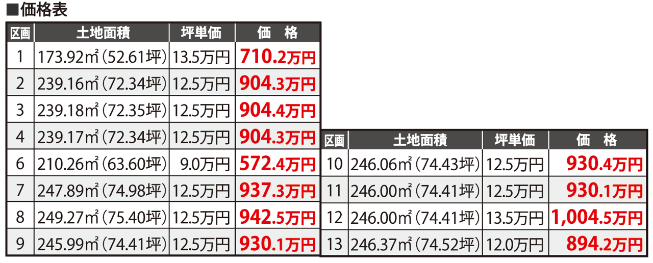 | 価格 | 572.4~1004.5万円 | 坪単価 | 9~13.5万円 |
