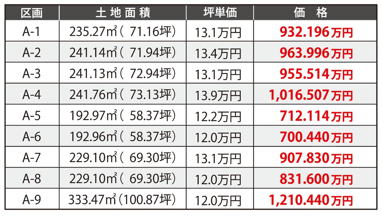 | 価格 | 700~1210万円 | 坪単価 | 12~13.9万円 |