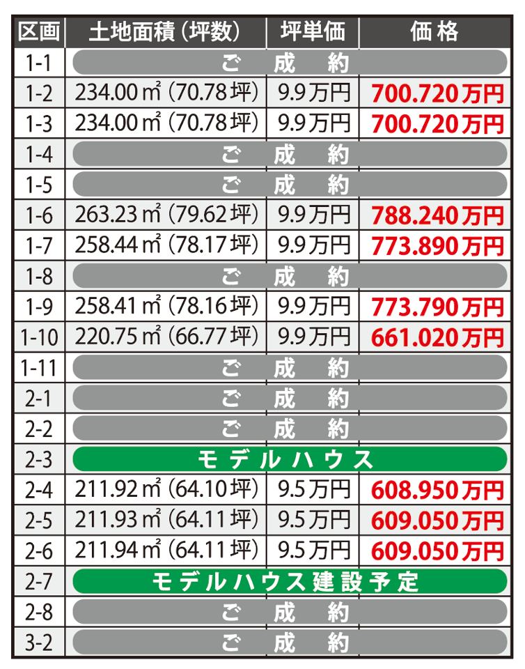 土地面積 | (公簿)211.92m2/64.1坪 ~263.23m2/79.62坪 |