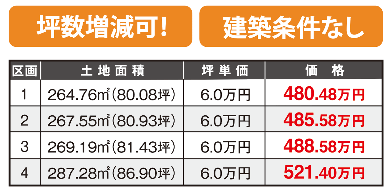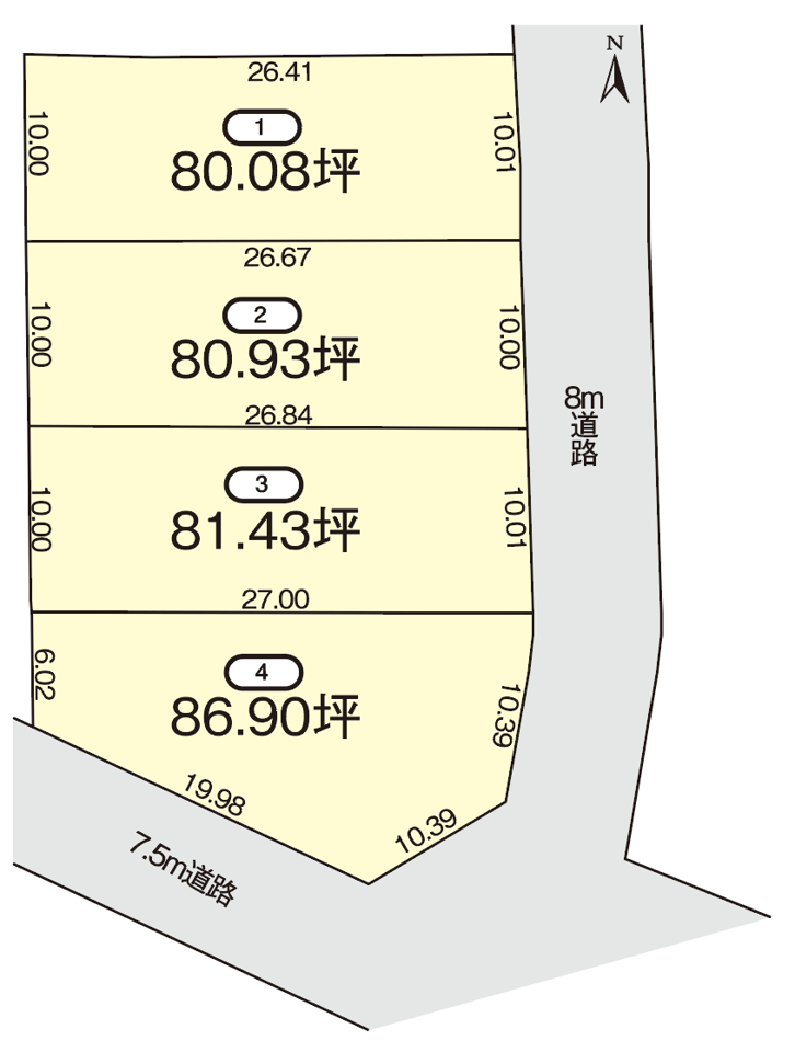 | 土地面積 | (公簿)264.76m2/80.08坪 ~287.28m2/86.9坪 |