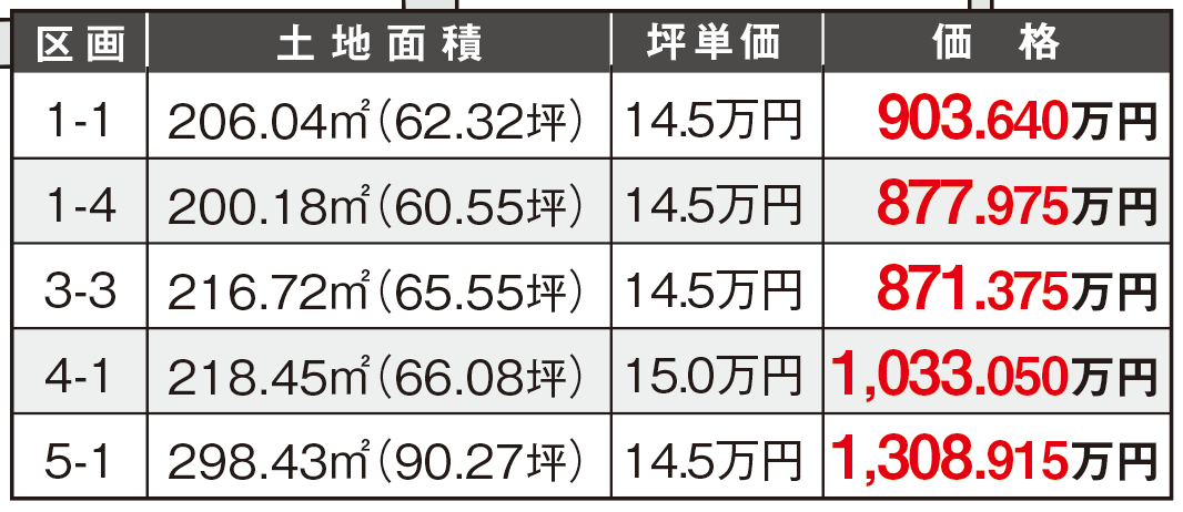 | 価格 | 871.375~1308.915万円 | 坪単価 | 14.5~15万円 |